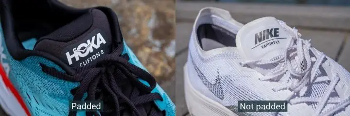 - Padded: shoes have noticeable padding placed usually on the tongue, heel collar, overall upper.