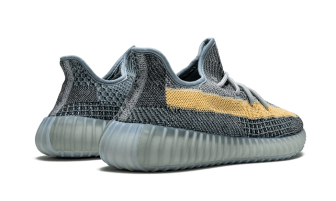 The Adidas Yeezy Boost 350 V2 Ash Blue features the usual construction with a Primeknit upper combining various shades of grey and blue. A contrasting beige stripe completes the colour scheme. Finally, there is a light blue semi-translucent sole and matching round laces.