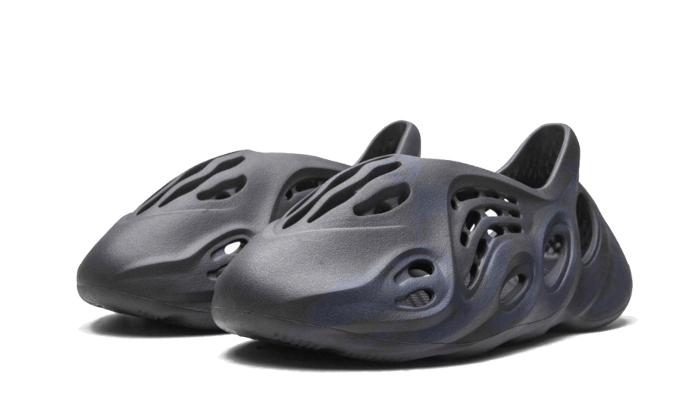 The Adidas Yeezy Foam RNNR Mineral Blue features the usual elaborate one-piece moulded construction. The slip-on with oval cut-outs features a tie and dye blend of black and navy blue. There are also several holes that add to the fashionable silhouette.
