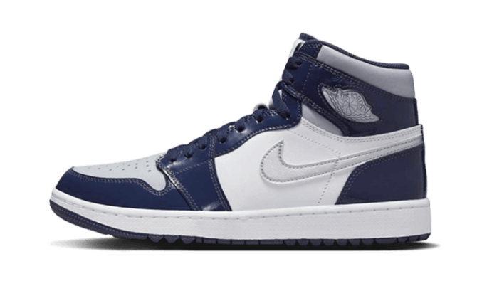 La Air Jordan 1 High Golf Midnight Navy affiche une base en cuir blanc accompagnée de superpositions en cuir verni bleu marine. Des touches de cuir gris sont également dispersées sur la paire sur le Swoosh latéral mais également au niveau du col et de la toebox. Une semelle crantée et un branding golf sur l’insole peaufinent le tout.