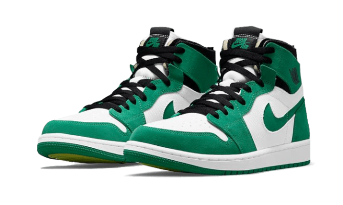 The Air Jordan 1 High Zoom Air CMFT Stadium Green opts for a white mesh base, a material that offers maximum lightness. The side panels appear to be cut away to reveal green Swooshes. The various overlays that make up the upper feature suede in the same shade, creating a color-block simple but effective. The cushioning used, the Zoom AirThis is even more powerful than the one used on the classic versions of the model.