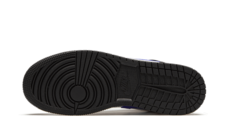 TheAir Jordan 1Mid Black Racer Blue White features a leather upper. Alternating white inserts on the sides and toebox and black parts on the rest of the upper play on the contrast while a blue Swoosh brings the touch of color. A white Wings logo and a yellow Jumpman on the tongue complete the pair.