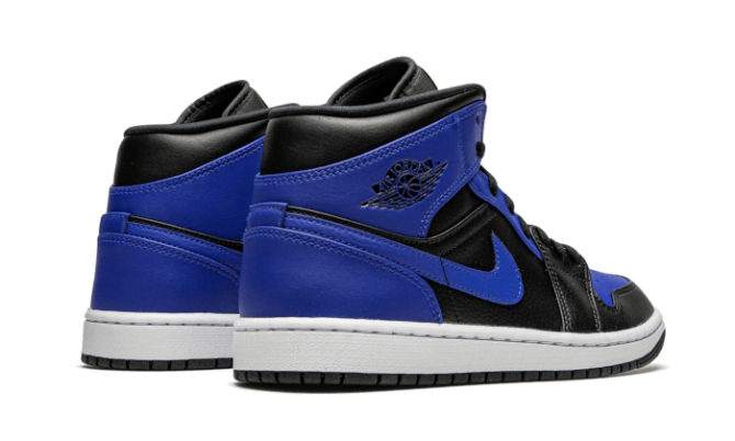 The Air Jordan 1 Mid Hyper Royal Tumbled Leather opts for the usual leather base. A two-tone color-block composes the design, so we observe overlays of royal blue on a black base. A mini Jumpman in a lighter blue on the tongue stands out. Finally, the whole thing rests on a white midsole completed with a black outsole.