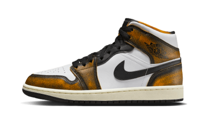 The Air Jordan 1Mid SE Orange Wear-Away is presented through a white leather upper that covers the collar as well as the toebox . There are black leather overlays with acrackled effect that reveal yellow . A logo Wings can be guessed at the ankle through the damaged aspect of the flap.The whole set rests on a beige sole with a vintage look.