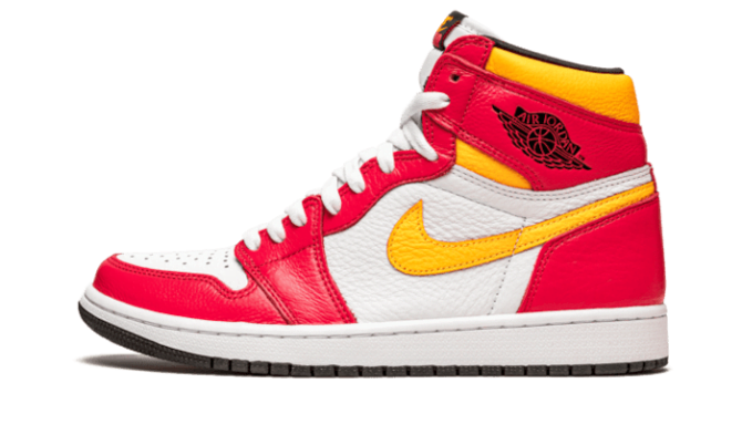The Air Jordan 1 Retro High OG Light Fusion Red features an elaborate white leather upper. There are also leather overlays in red and pink, as well as several orange-yellow details like the side Swoosh. The iconic Wings logo in black at the ankle, branding on the tongue, and a white midsole finish off the great Peter Moore design.
