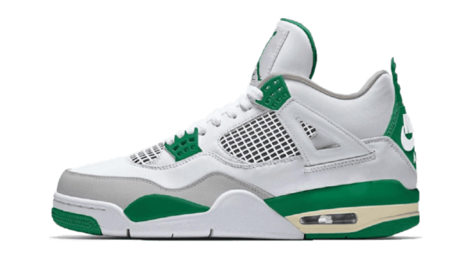 The Air Jordan 4 Retro Pine Green opts for a smooth white leather upper with a few touches of green throughout the pair, such as the eyelets and heel. A light grey mudguard on the lining completes the look while a Jumpman on the tongue and the popular Nike Air tag on the heel finalize the look.