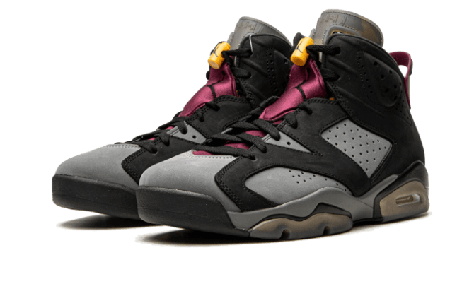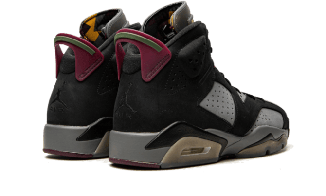The Air Jordan 6 Bordeaux gird oneself The shoe has a suede base in a mix of grey and black. Touches of burgundy, yellow, green or turquoise are found on the tongue and outsole, while a black midsole completes the design.