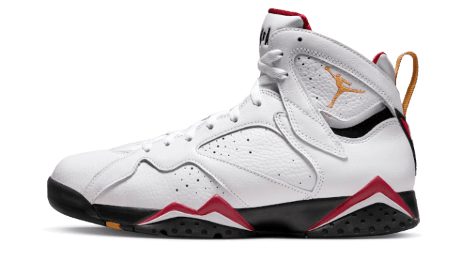 The Air Jordan 7 Retro Cardinal (2022) takes the construction of the original model. It features a white grained leather upper with smooth tone-on-tone leather inserts. Touches of red, black and yellow are scattered on the sole, collar and lining and match the brandings.
