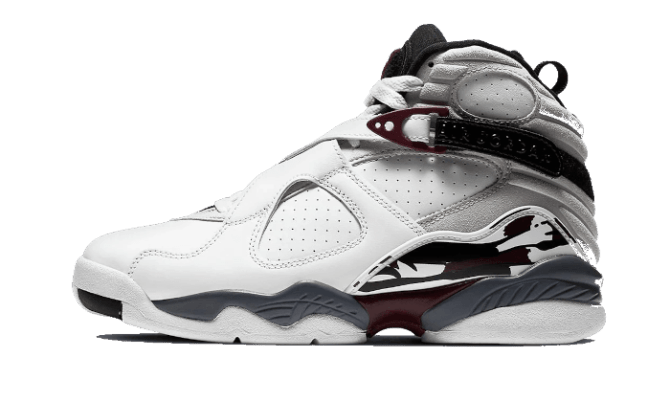 The Air Jordan 8 Burgundy is adorned with a leather upper that alternates between a smooth and perforated look. Grey suede inserts are added to the silhouette. There is also a tri-color chenille patch and a metallic buckle on the straps! The Jumpman logo is affixed to the outsole.