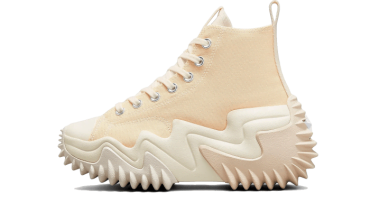 The Converse Run Star Hike Hi Lotus features a light pink fabric base with exposed seams to reinforce the retro feel of the design. The pair is directly inspired by the The gum inserts at the front and back of the shoe form the oversized sole that is so characteristic of the model.