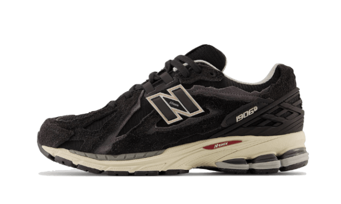 The New Balance 1906R Protection Pack Black displays a base in black mesh accompanied by overlays to torn effect in grey suede and hairy black suede. Black accents are added to the reinforcement of the TPUthe sole and the logo “N“that combines with the eyelets. A midsole N-Ergy with an aged shade, like the This is the perfect way to provide exceptional comfort in a vintage look.