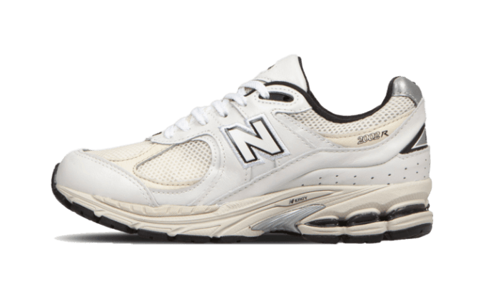 The New Balance 2002R Atlas Grey Lemon Haze features a white mesh upper with white leather overlays. We note the usual branding New Balance on the quarter panel and a 2002R tag near the collar.