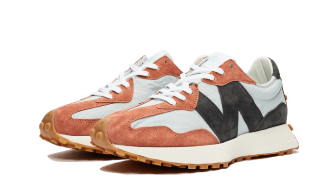 The New Balance 327 Brown Grey features a fabric and suede upper in Terracotta hues. A combination of grey and ochre enhances the light grey base, while white laces, a gumsole and the iconic “N” on the sides complete the design.