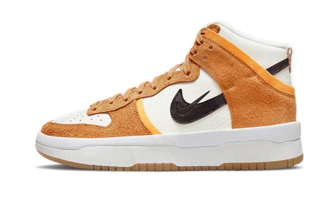 The Nike Dunk High Up Rebel Mars Yard unveils an off-white leather base highlighted by light brown suede overlays and some more orange suede notes. A black leather side Swoosh, lined with a mini Swoosh also in black leather, brings contrast to this silhouette. The white and brown wedge sole polishes off the look.