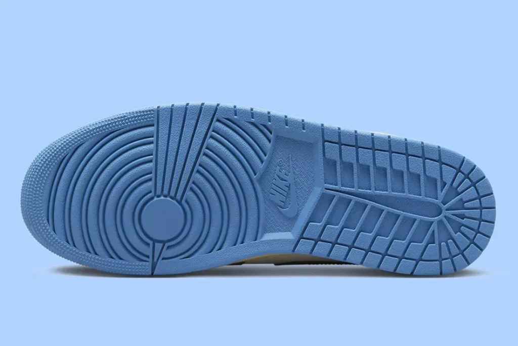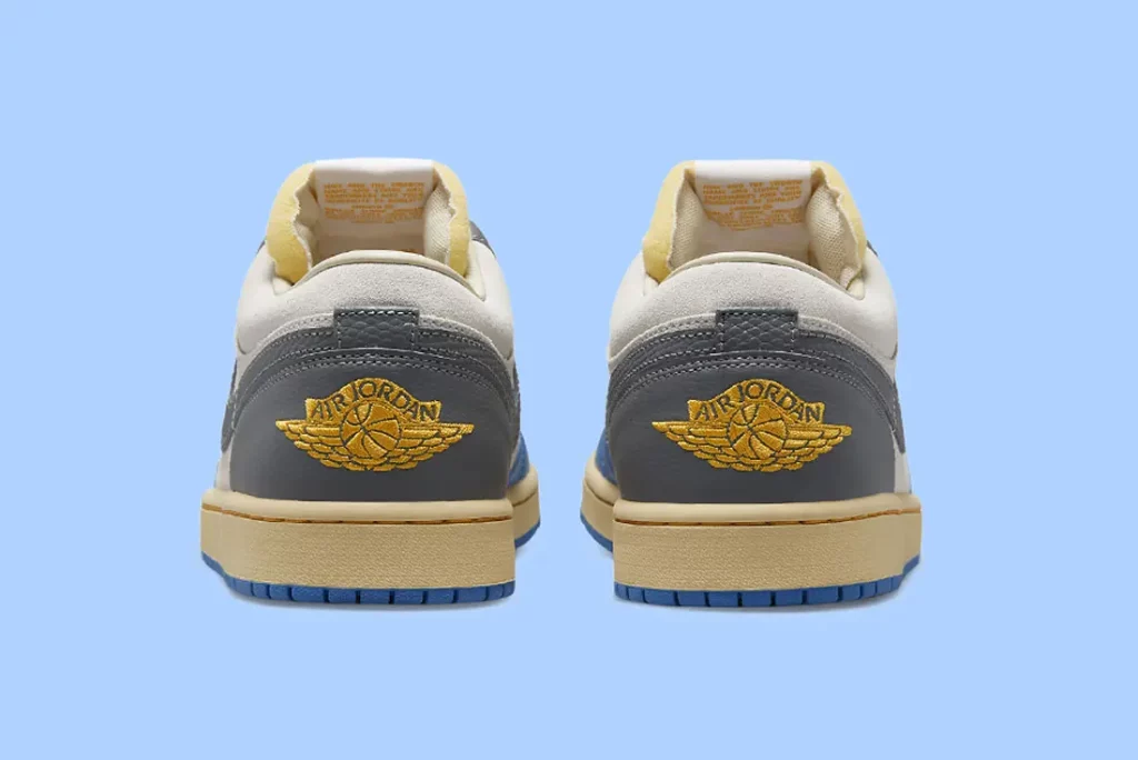This new colourway has been given the moniker ‘UNC Grey’ and is a twist on the regular Jordan Brand ‘UNC’ combo. The base layer still remains in the regular white leather, while the toe box has been dressed in blue. Towards the rear are darker grey tones and a yellow embroidered Wings logo. Jordan Brand have once again opted for an aged vibe with the midsole pre-yellowed and exposed foam reaching the tongue.